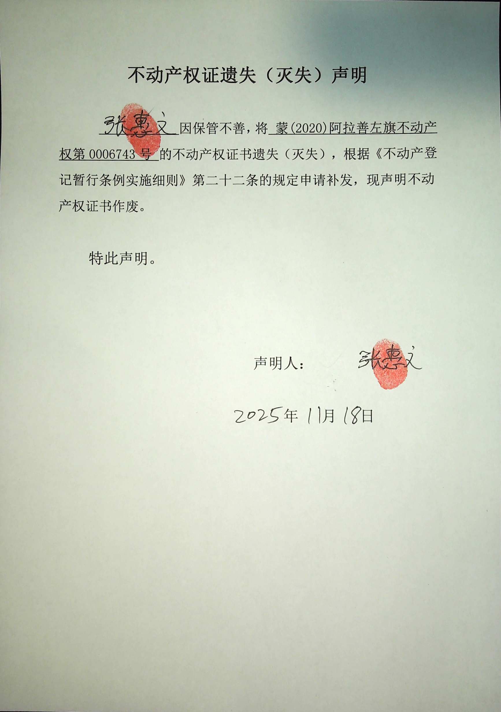 不動產權證遺失聲明(張惠文)