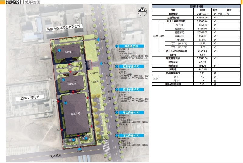 調整后規劃指標:項目規劃總用地面積29110.34平方米,總建筑面積45905.41平方米,其中地上建筑面積39009.46平方米,地下建筑面積6895.95平方米,容積率1.34,建筑密度42.5%,綠地率35%,機動停車位121輛,非機動停車位117輛。項目建設綜合樓、檢測車間、精煉車間、甲類倉庫、丁類倉庫、廣場、道路、停車場及其配套設施。