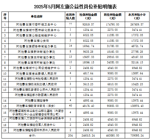 2025年5月阿拉善左旗為在崗204人發(fā)放公益性崗位社保補(bǔ)貼及崗位補(bǔ)貼709095.24元,其中崗位補(bǔ)貼463080.00元、社保補(bǔ)貼246015.24元。