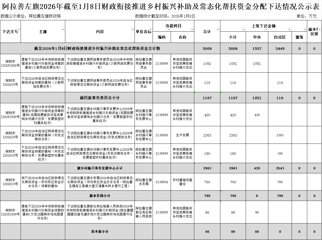 阿拉善左旗財政局關(guān)于2026年截至1月8日財政銜接推進鄉(xiāng)村振興補助及常態(tài)化幫扶資金分配下達情況的公告公示