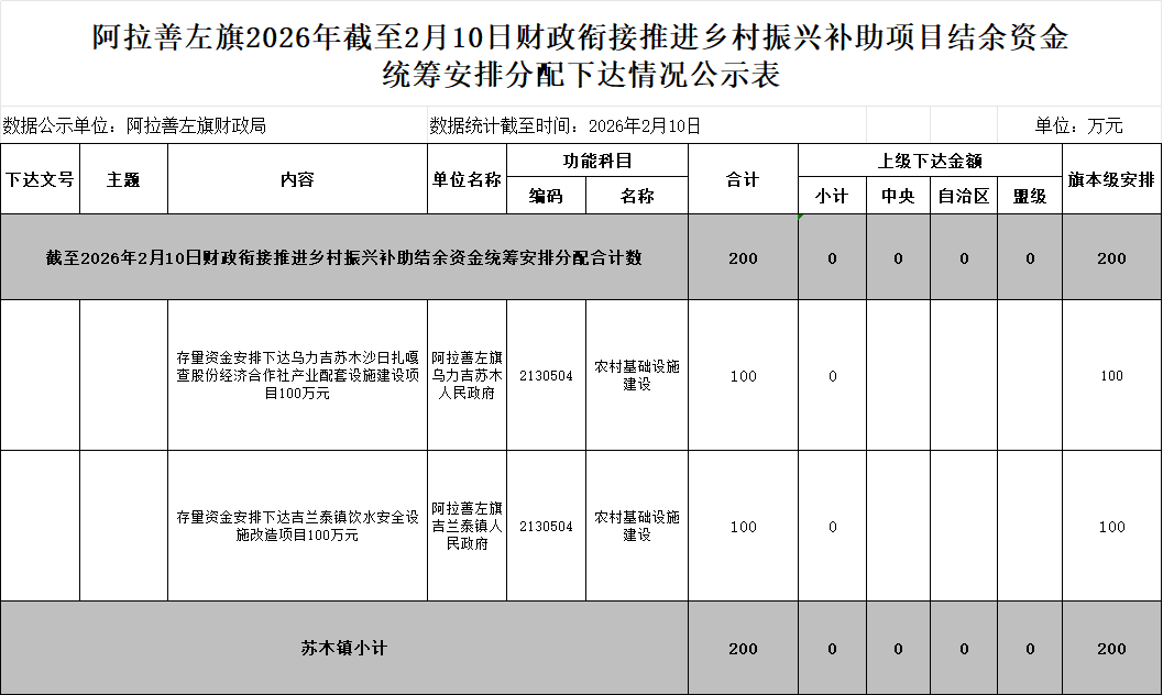 阿拉善左旗財政局關于2026年截至2月10日財政銜接推進鄉村振興補助項目結余資金統籌安排使用投入情況的公告公示