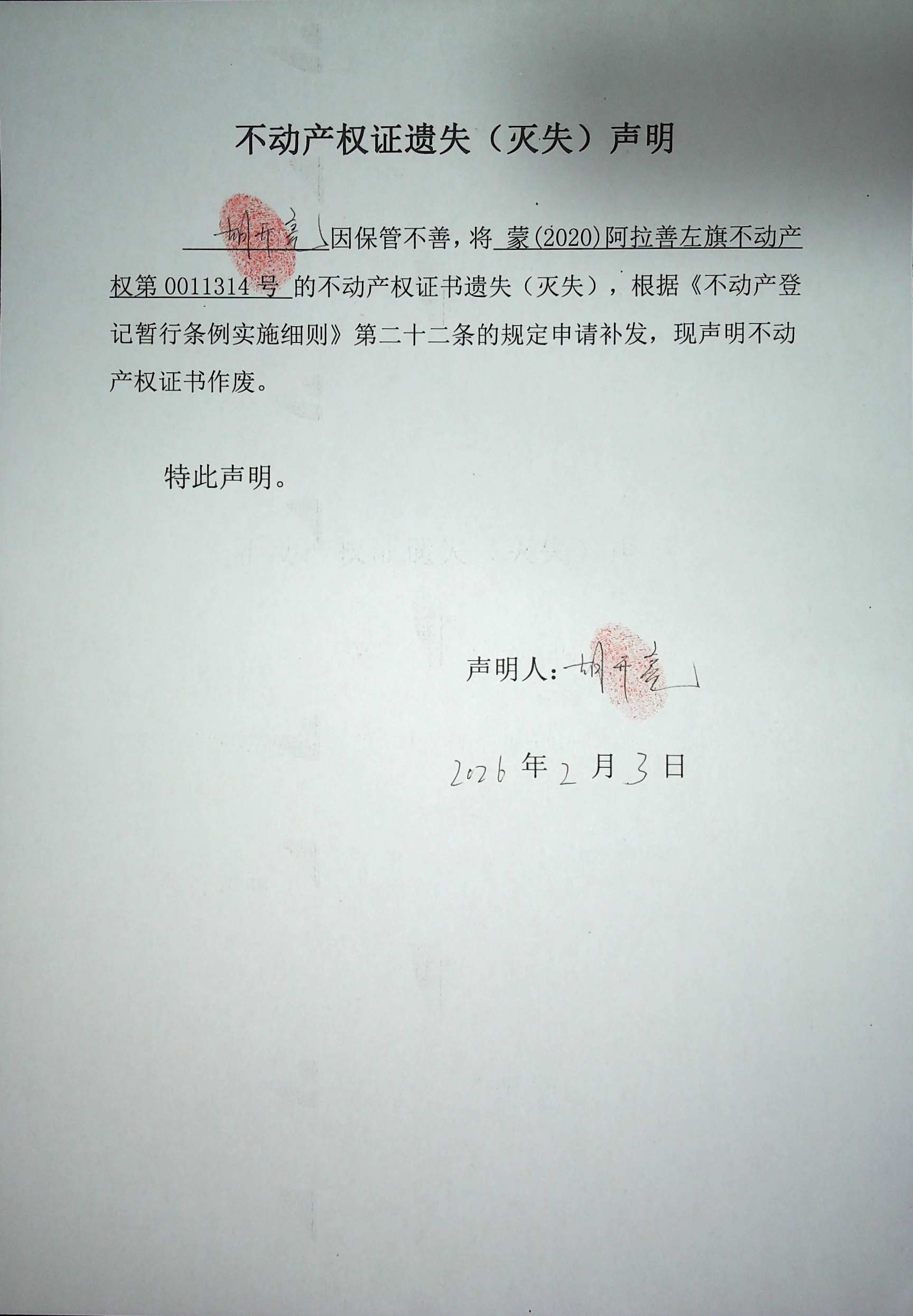 不動產權證遺失(滅失)聲明(胡開亮)