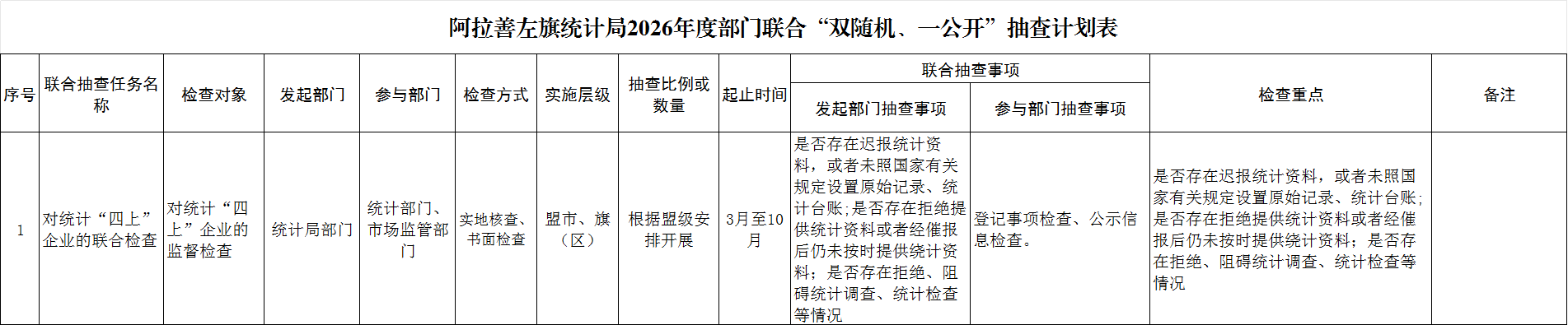 阿拉善左旗統計局“雙隨機、一公開”及“一單兩庫一細則”(2026年)情況公開
