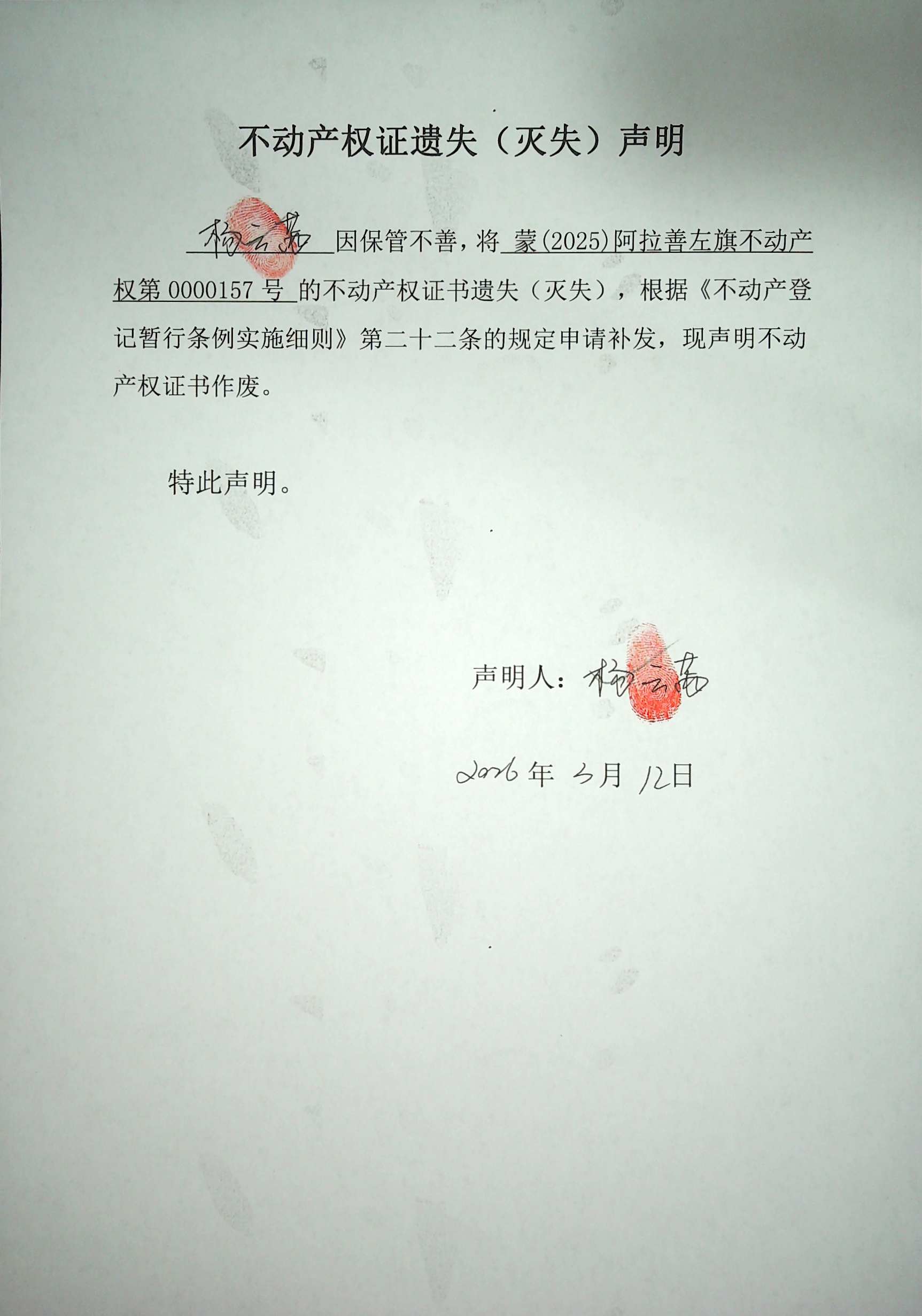 不動(dòng)產(chǎn)權(quán)證遺失(滅失)聲明(楊云茜)