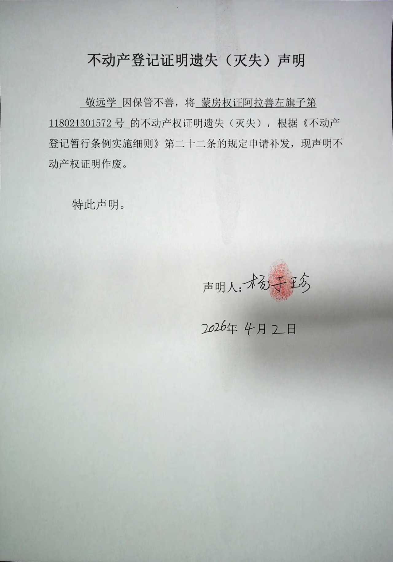 不動(dòng)產(chǎn)登記證明遺失(滅失)聲明(楊于珍)